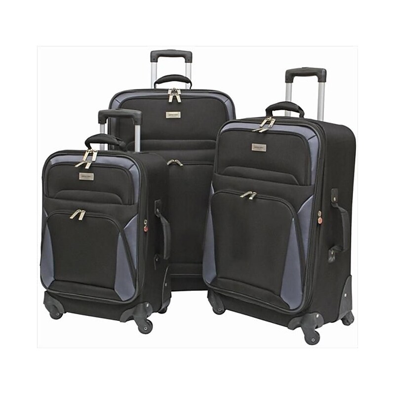 Make traveling simple with this three piece luggage set by Geoffrey Beene. Designed with 360 spinner wheels, these bags offer expandable storage (up to 2" additional space per bag) and a durable polyester weave outer shell. The telescoping handles and large outer pockets make this set perfect for rolling around the airport or packing for a long road trip. Set includes 3 luggage pieces: a 21" carry-on suitcase, a 25" suitcase, and a 28" suitcase. 3 piece luggage bag set. Upscale spinner wheel system. Widebody designs. Push button telescopic handle. 21" carry-on suitcase measures 21" H x 14" W x 8" D (+ 2" when expanded) and weighs 8 lbs. 25" suitcase measures 24" H x 16" W x 85" D (+ 2" when expanded) and weighs 9 lbs. 28" suitcase measures 28" H x 175" W x 10" D (+ 2" when expanded) and weighs 10 lbs. Fully lined interior. Made from polyester.