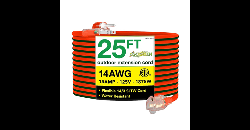 The GoGreen Power Heavy-Duty Extension Cord is ideal for multiple applications around your home's exterior and garage. It resists moisture, abrasion and exposure to sunlight. The length of the outdoor extension cord allows you to cover a large area without the need for continuous stops to remove and replug. Use it to power your electric tools, lawn mower, to operate your generator and to provide lighting and music while entertaining. The cord is ETL listed and features a light on the end that shines when it's in use. Resists moisture, abrasion and exposure to sunlight. ETL Listed / Certified. Lighted end plug. ⚠ WARNING: This product contains chemicals known to the state of California to cause cancer and birth defects or other reproductive harms. Wash hands after handling the product. GoGreen Power grounded heavy duty extension cord provides polarized security and lighted end plug to show power is on.