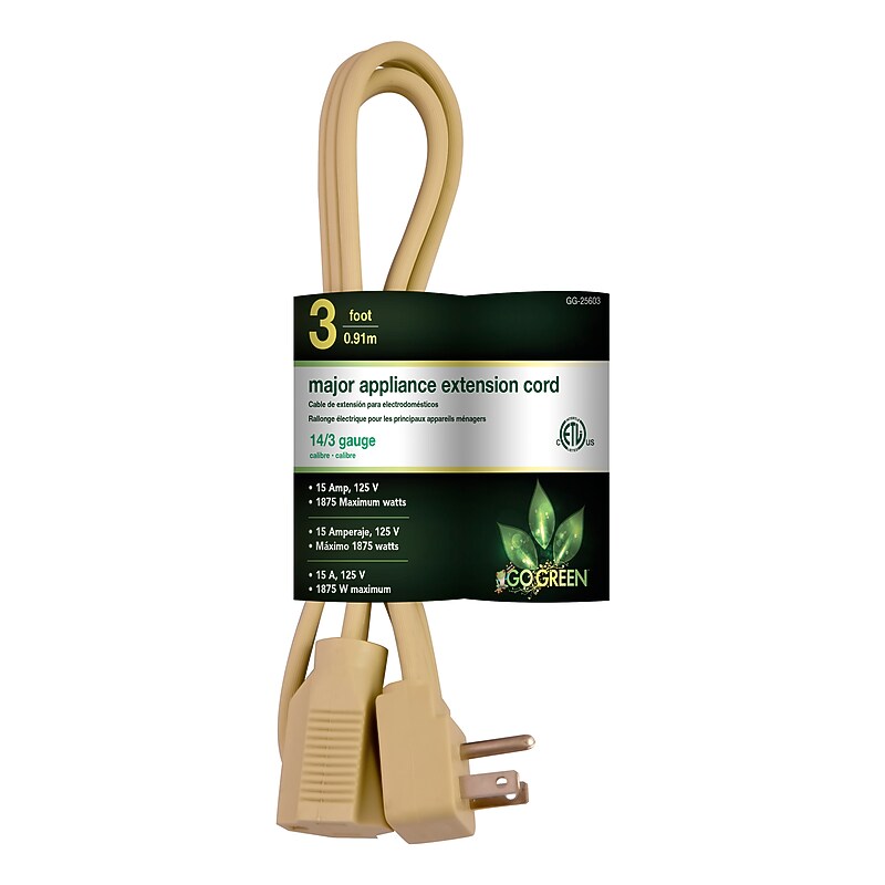 Make sure any cord can reach the plug with a 14/3 appliance cord from GoGreen Power. It can be used with a number of different appliances, such as an air conditioner, washer and dryer, dishwasher or a fridge. Theextension cord features a grounded three prong head. Flat extension cord with molded end plugs. Kink-resistant extension cord. Cord. ⚠ WARNING: This product contains chemicals known to the state of California to cause cancer and birth defects or other reproductive harms. Wash hands after handling the product. GoGreen Power heavy duty appliance cord is the ideal cord for all your indoor appliances needs.