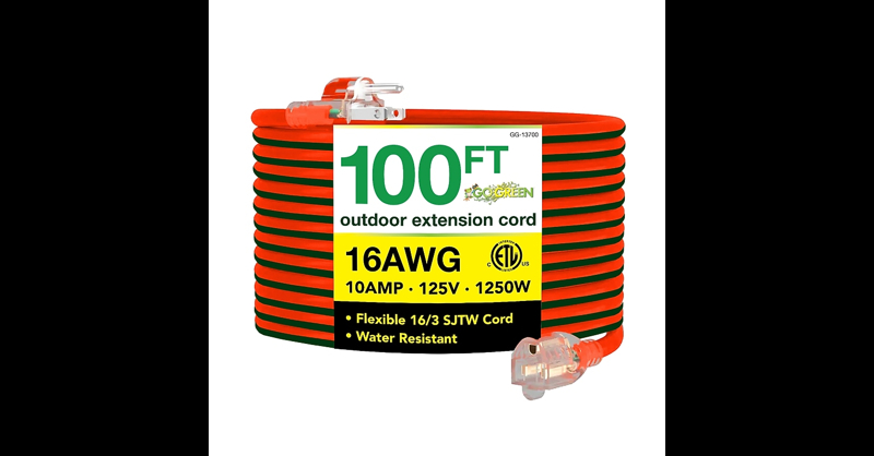 The GoGreen Power Heavy-Duty Extension Cord is ideal for multiple applications around your home's exterior and garage. It resists moisture, abrasion and exposure to sunlight. The length of the outdoor extension cord allows you to cover a large area without the need for continuous stops to remove and replug. Use it to power your electric tools, lawn mower, to operate your generator and to provide lighting and music while entertaining. The cord is ETL listed and features a light on the end that shines when it's in use. Resists moisture, abrasion and exposure to sunlight. ETL Listed / Certified. Lighted end plug. ⚠ WARNING: California Proposition 65 Warning. This product can expose you to chemicals including lead, which are known to the State of California to cause cancer and birth defects or other reproductive harm. For more information go to www. P65Warnings. ca. gov . GoGreen Power grounded heavy duty extension cord provides polarized security and lighted end plug to show power is on.