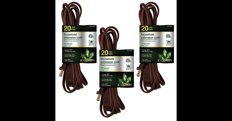 GoGreen's 2-prong extension cord comes equipped with 3 outlets and is rated for indoor use only. Perfect for devices such as lamps, phone chargers, fans, heaters, and many other electronics. Rated at 125 Volts, the 2-prong cord can be plugged into a standard 3-prong 120V AC outlet. The 16 gauge kink-free cord is safe and reliable, providing superb insulation. Each extension cord is fixed with a safety cover for extra protection. There are 3 Extension Cords per order. ETL Listed / Certified. 3 Outlets with protective safety cover. Great for use on small appliances. 20 ft. kink free cord. 16 Gauge. Each Extension Cord has 3-Outlets. 3 Extension Cords per Pack. ⚠ WARNING: This product contains chemicals known to the state of California to cause cancer and birth defects or other reproductive harms. Wash hands after handling the product. The GoGreen Power household extension cord is great for indoor use in the office and at home. 3 Extension Cords/Pack.