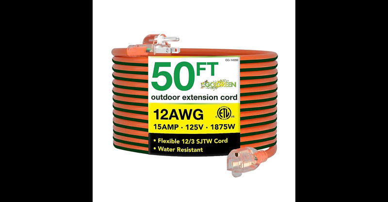 The GoGreen Power 12/3 Heavy-Duty Extension Cord is ideal to use for equipment and tools. It is designed to resist moisture, abrasion and prolonged exposure to sunlight. The extension cord has a lighted end and heavy-duty molded plugs. This contractor-grade cable is also ETL listed for safety with a maximum power rating of 1875 watts at 15 Amp and 125V. This item is specially designed for outdoor use. Resists moisture, abrasion and exposure to sunlight. ETL Listed / Certified. Lighted end plug. ⚠ WARNING: This product contains chemicals known to the state of California to cause cancer and birth defects or other reproductive harms. Wash hands after handling the product. GoGreen Power grounded heavy duty extension cord provides polarized security and lighted end plug to show power is on.