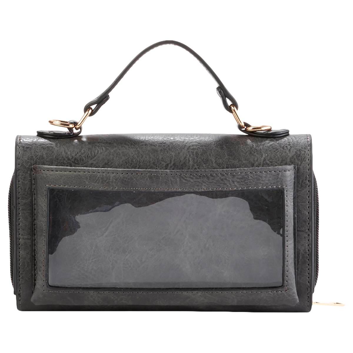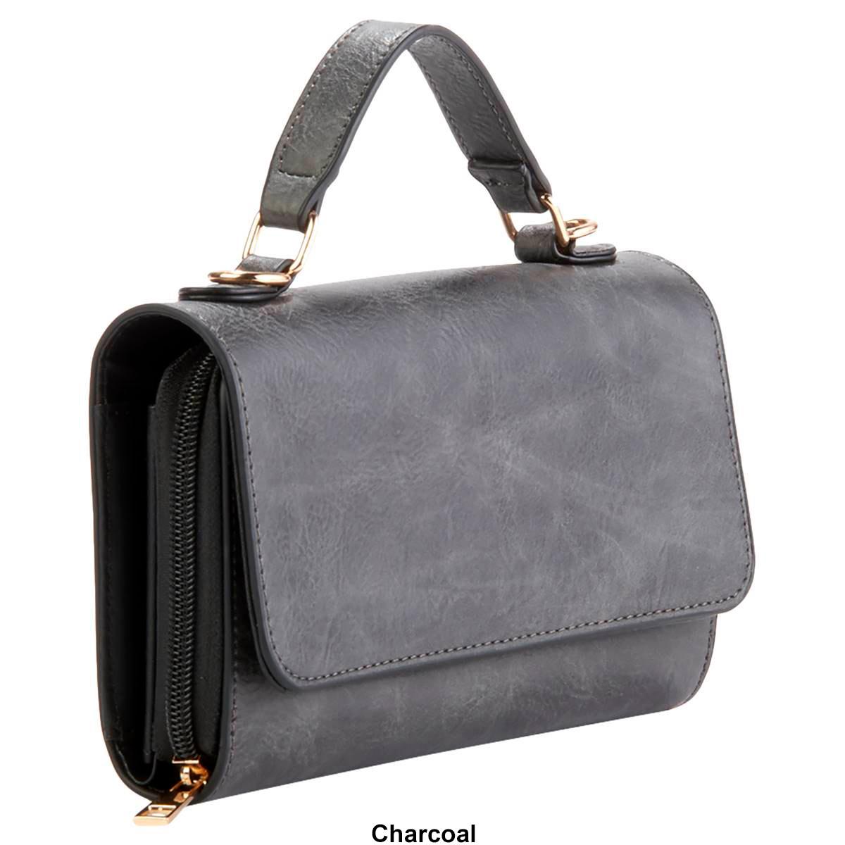 Pattern: Solid Top handle Phone window w/ touch screen Magnetic snap closure Interior: 4 credit card slots, 4 slip pockets, 1 zip pocket Detachable crossbody strap.