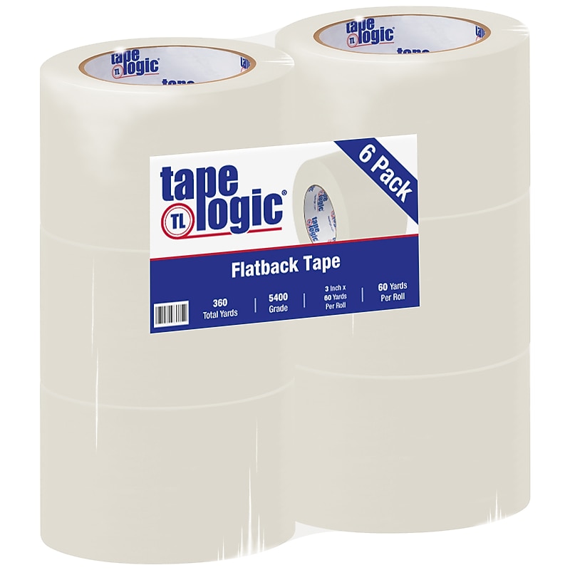 3" x yds.(6 Pack) Tape Logic #5400 Flatback Tape. Aggressive adhesive yet light weight makes this tape ideal for carton sealing applications providing cost savings in shipping. Stronger than masking tape. Easy application - just tear and apply by hand. No water or dispensers needed. Write directly on tape. Seals securely under a wide range of temperature and humidity conditions. Natural white tape. Aggressive adhesive yet light weight makes this tape ideal for carton sealing applications providing cost savings in shipping. Stronger than masking tape. Easy application - just tear and apply by hand. No water or dispensers needed. Write directly on tape. Seals securely under a wide range of temperature and humidity conditions. Natural white tape.