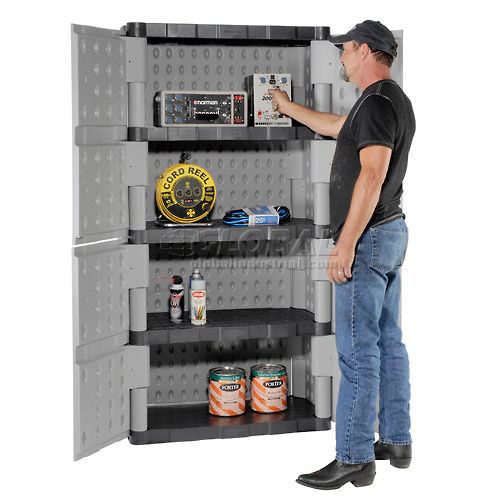 Conveniently store and organize supplies and equipment. Corrosion and dent resistant plastic construction with lockable doors for security.Cabinet is gray and is virtually maintenance free and easy to clean. Features 4 fixed shelves for stability. Fixed shelves have up to 138 lb. capacity. Doors are padlockable for security. Snap together construction assembles in 15 minutes.