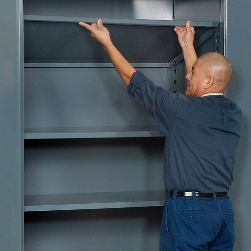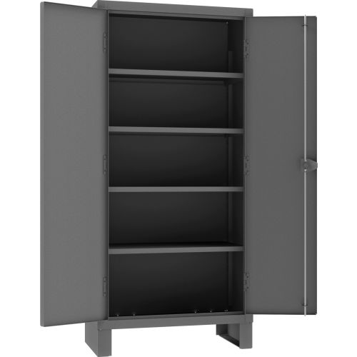 EXTRA HEAVY DUTY STORAGE CABINETS Storage Cabinet Extra heavy duty storage cabinet is built to last with heavy gauge, all welded steel. Made using heavy duty, all welded 12 gauge steel with gray powder coat finish. Padlockable 3-point latching system with 3/8" diameter locking rods offers superior security. Dual doors swing open 180 and feature 4"H x 7 gauge leaf hinges with secure hinge pins and cast iron handles. 14 gauge shelves adjust at 2-1/2" increments. Base allows forklift access using two 6"W x 3/16" thick legs. Legs are pre-drilled to allow floor anchoring. Fully assembled.