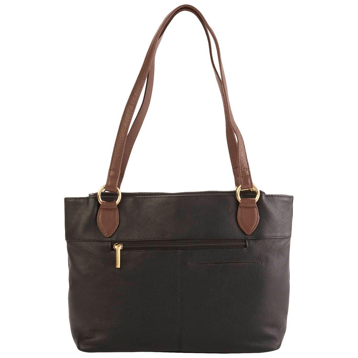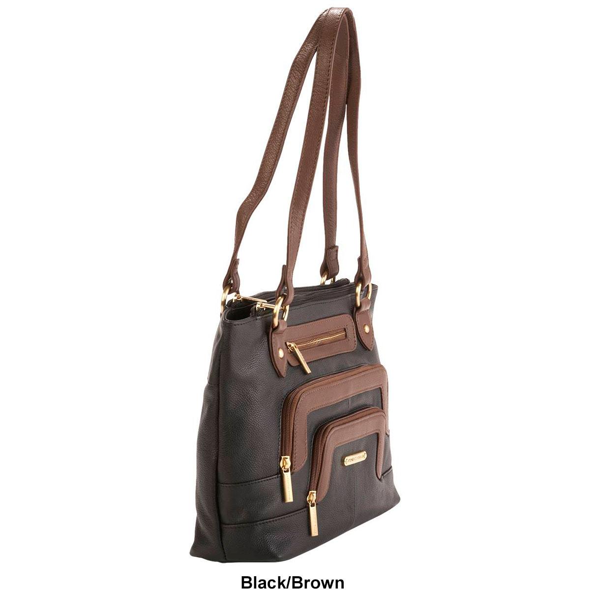 Pattern: Color Block Double tote handles Top zipper closure Three compartments Interior: One zip pocket, two slip pockets Exterior: Four zip pockets, one slip pocket.