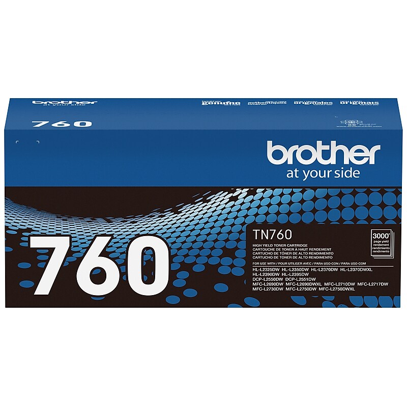 Handle every printing job in the office with thistoner cartridge for select Brother laser printers. The Brother TN760 high-yieldtoner creates easy-to-read text, making it ideal for contracts, reports and other documents. With a 3,000-page yield*, this Brother toner cartridge provides reliable daily function. Compatible with Brother DCP-L2550DN, DCP-L2550DW, HL-L2350DW, HL-L2370DN, HL-L2370DW, HL-L2370DW XL, HL-L2375DW, HL-L2390DW, HL-L2395DW, MFC-L2710DN, MFC-L2710DW, MFC-L2750DW, MFC-L2750DWXL. Page Yield of up to 3,000 pages*. Intelligently engineered as part of a complete printing system to work seamlessly with your Brother printer. Brother Genuine TN760 Black High-Yield Toner Cartridge. Brother Genuine toner produces superior quality results that withstand the test of time. Brother offers an environmentally responsible way to dispose of Brother Genuine cartridges. Visit www. brother-usa. com/environment for more information. Disclaimers: *Approximate cartridge yield in accordance with ISO/IEC 19752 (letter/A4). Safety Data Sheet . Deliver crisp, clear images and text with this Brother TN760 high-yieldtoner cartridge.