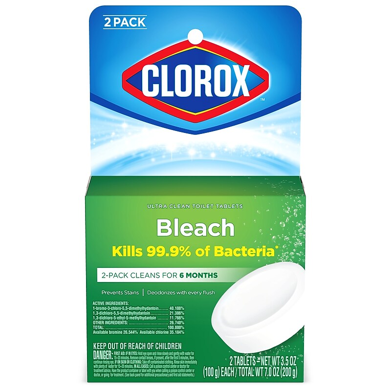 Clorox Ultra Clean Toilet Tablets kill 99. 9% of bacteria and deodorizes your toilet with the power of Clorox bleach. This toilet bowl cleaning tablet, effectively cleans and prevents stains with each flush, eliminating the need to scrub every time. Each tablet delivers a long-lasting bleach clean and is good for up to 3 months. Simply drop a tablet into your toilet tank to continuously sanitize, deodorize and clean your toilet every time you flush. The dissolvable cleaning tablets help prevent tough stains and removes hard water, mineral deposits and limescale stains. Ideal for use in restaurants, cafeterias, offices, hotels, daycares and other commercial facilities. Keep your toilet bowl sparkling fresh and ultra clean with no mess and no fuss with the help of Clorox Ultra Clean Toilet Tablets. ULTRA CLEAN TOILET BOWL TABLETS: Kills 99. 9% of bacteria, and continuously sanitizes, cleans and deodorizes your toilet bowl with each flush; Packaging may vary. BLEACH TOILET BOWL CLEANER: Toilet bowl cleaning tablet cleans your toilet and leaves your bowl sparkling fresh and smelling clean for up to 3 months. PREVENT STAINS: Dissolvable cleaning tablets help prevent tough stains and removes hard water, mineral deposits and limescale stains, with the power of Clorox bleach. DEODORIZES: Each tablet sanitizes the toilet bowl water in 5 minutes for 6 weeks to keep your toilet smelling fresh and sparkling clean with every flush. GREAT FOR COMMERCIAL USE: Ideal for use in offices, day care centers, schools, hotels, restaurants and other commercial facilities. Kill 99. 9% of bacteria and deodorize with every flush with Clorox Ultra Clean Toilet Tablets with Bleach.