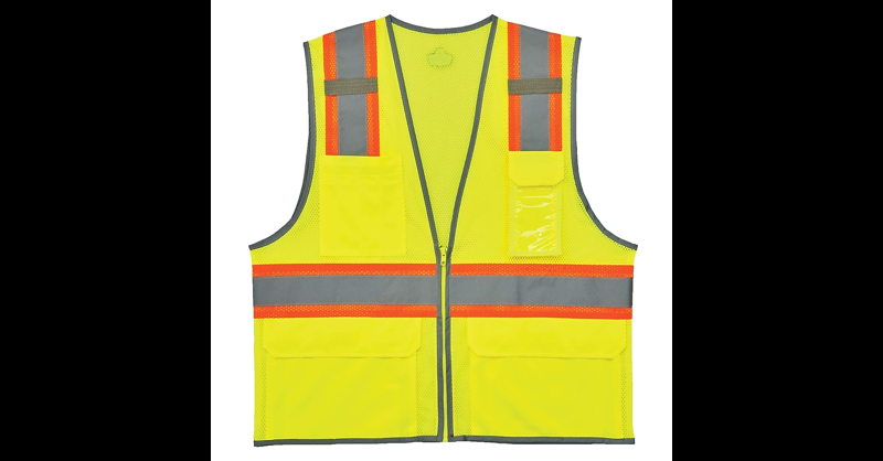Class 2 Two-Tone Mesh Vest w/ Reflective Binding: Breathable mesh, tons of storage and reflective binding accents. ANSI-compliant polyester mesh (3. 3oz). Zipper closure. 2" ANSI-compliant reflective. Reflective set on 3. 5" contrasting mesh background. Reflective binding accents outline the wearer. Pockets: Two inside, four outside. Clear ID badge holder on cell phone pocket. Dual radio mic tabs.
