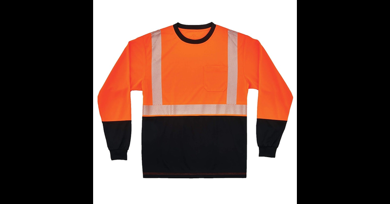 Class 2 Black Front Performance Long Sleeve T-Shirt: Lightweight birdseye knit paired with 3M Scotchlite Comfort Trim. ANSI-compliant polyester breathable knit (4. 1oz). Moisture wicking treatment. 30+ UPF for protection against harmful UV. 2" ANSI-compliant 3M Scotchlite Comfort Trim segmented reflective. Under-arm vents. Pockets: One outside chest. Black front, sleeves and collar hide dirt and wear.