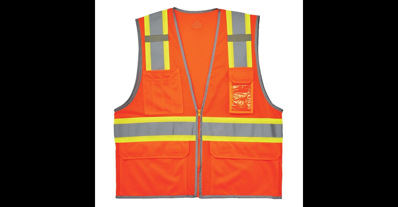 Class 2 Two-Tone Mesh Vest w/ Reflective Binding: Breathable mesh, tons of storage and reflective binding accents. ANSI-compliant polyester mesh (3. 3oz). Zipper closure. 2" ANSI-compliant reflective. Reflective set on 3. 5" contrasting mesh background. Reflective binding accents outline the wearer. Pockets: Two inside, four outside. Clear ID badge holder on cell phone pocket. Dual radio mic tabs.