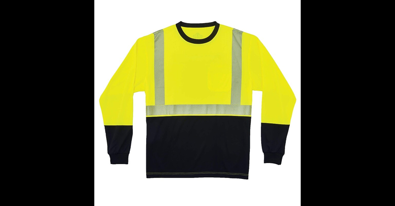 Class 2 Black Front Performance Long Sleeve T-Shirt: Lightweight birdseye knit paired with 3M Scotchlite Comfort Trim. ANSI-compliant polyester breathable knit (4. 1oz). Moisture wicking treatment. 30+ UPF for protection against harmful UV. 2" ANSI-compliant 3M Scotchlite Comfort Trim segmented reflective. Under-arm vents. Pockets: One outside chest. Black front, sleeves and collar hide dirt and wear.