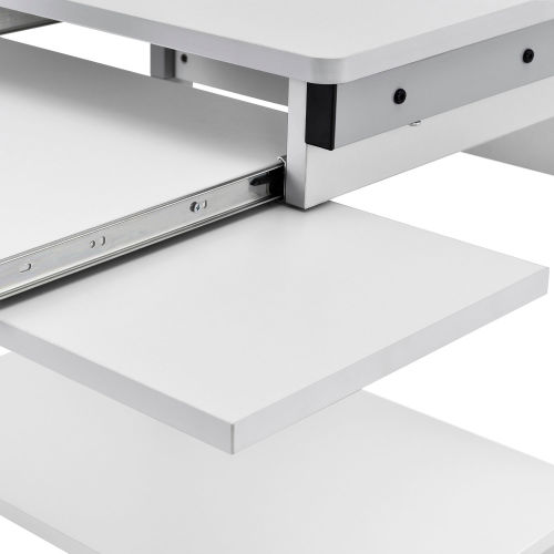 This unit is a mobile workstation only. The computer monitors and other equipment shown in the photos are not included. This mobile computer workstation allows you to work comfortably standing up. Tubular steel frame is reinforced by 2 panels for added stability. Gray laminate top work surface and keyboard shelf are moisture and scratch resistant. Top work surface and printer shelf adjust at 2" increments. Roll-out keyboard shelf adjusts 40" to 46" height. Mouse shelf stores away under the keyboard shelf. The steel bottom storage shelf is fixed. 4" non-marring casters (2 locking) make for easy maneuverability. Easy assembly. Specifications: Top Platform: 25-1/2"W x 22"D Roll-Out Keyboard Shelf: 21"W x 16"DPrinter Shelf: 25-1/2"W x 17"DMouse Shelf: 9"W x 12"D Adjustable CPU Holder: 10-1/4"W x 10-1/2"DOverall Dimensions: 25-1/2"W x 22"D x 44-1/2"H Unit Weight: 65 lbs.