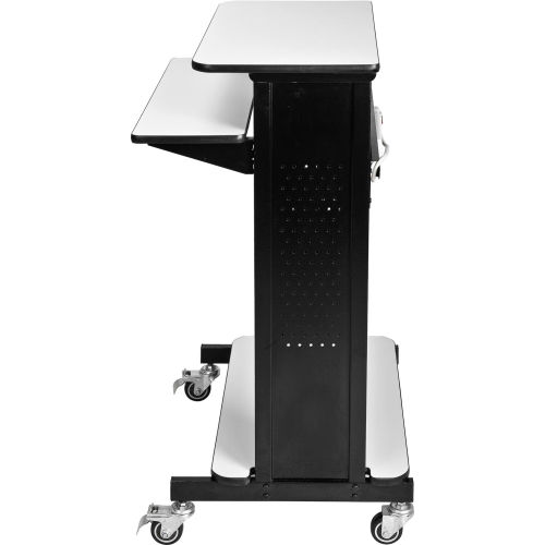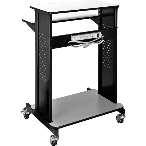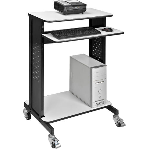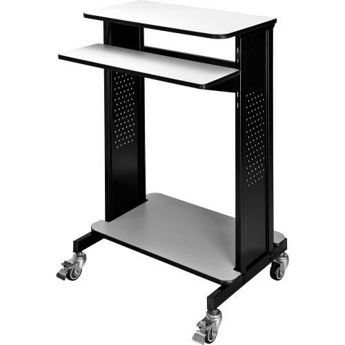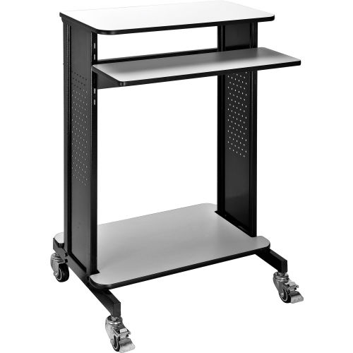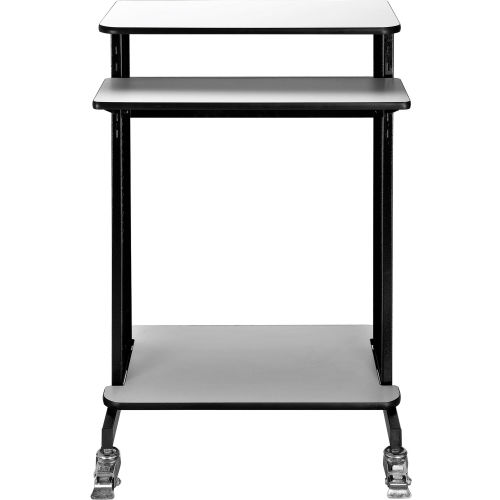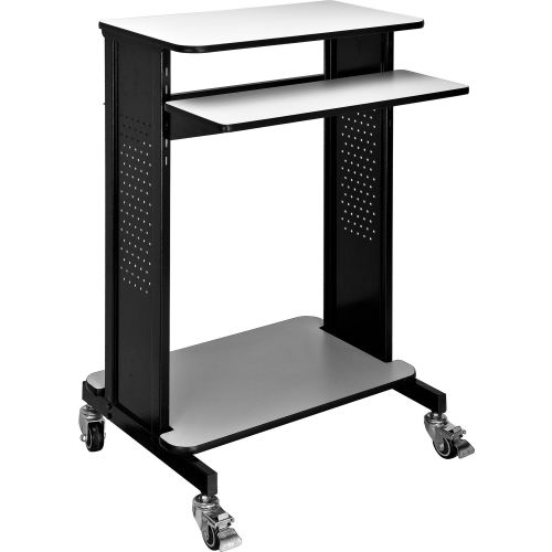 Global Industrial Mobile Stand-Up Computer Workstation / Standing Desk This extra-tall 46"H workstation is designed for standing applications. Top work surface 28-3/4"W x 16"D supports your PC with room for supplies. Keyboard shelf is set at 36"H. Adjustable lower shelf measures 28-1/4"W x 18"D and holds supplies, a mini-tower CPU or printer. Four 1" swivel casters (2 locking). Sturdy black coated steel frame with 3/4" light gray laminate surfaces. Easy assembly. Optional 6-outlet power strip (model# 500881) is sold separately. Devices depicted in the image gallery are not included. Specifications: Top work surface: 28-3/4"W x 16"D Keyboard shelf: 28-3/4"W x 9-3/4"D Lower shelf: 28-1/4"W x 18"D Overall workstation: 28-3/4"W x 21-7/8"D x 46"H Gray laminate top work surface and keyboard trayBlack powder coated steel frame.