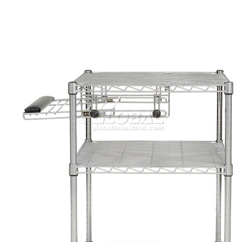 Nexel Chrome Wire Shelf Computer Workstation with Keyboard Tray, 30"W x 24"D x 34"H Transport computer and electronic equipment with ease with this mobile computer workstation. Open wire design minimizes dust accumulation and maximizes light and air circulation. Three shelves adjust on 1" increments. Sliding keyboard shelf with cushioned wrist rest accepts keyboards up to 21"W x 11"D. 6" height adjustment to ensure a comfortable typing position. Optional four 5" gray polyurethane or 2" dual-wheel, non-marring, swivel casters (two with dual lock). Attractive chrome finish. Easy assembly. Please Note: Optional document holder and caster set are sold separately. Devices depicted in the image gallery are not included.