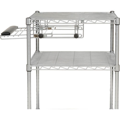 Organize computer and electronic equipment with ease with this computer workstation. Open wire design minimizes dust accumulation and maximizes light and air circulation. Three shelves adjust on 1" increments. Sliding keyboard shelf with cushioned wrist rest accepts keyboards up to 21"W x 11"D. 6" height adjustment to ensure a comfortable typing position. Optional four 5" gray polyurethane or 2" dual-wheel, non-marring, swivel casters (two with dual lock). Attractive chrome finish. Easy assembly. Please Note: Optional document holder and caster set are sold separately. Devices depicted in the image gallery are not included.
