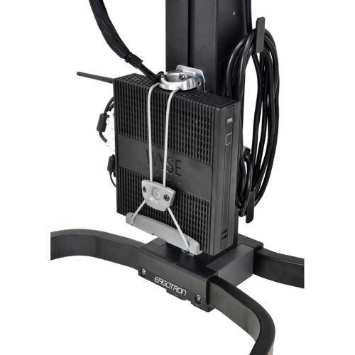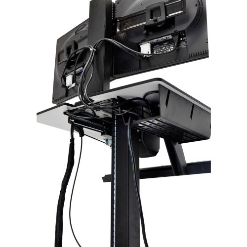 Devices depicted in the image gallery are not included. This innovative computer cart doubles as an adjustable standing desk platform. Stay energized and productive while you compute - move from a sitting to a standing position whenever you want. The large worksurface, back-tilt keyboard tray and independently adjustable dual-monitor stand make computing comfortable for prolonged periods. Counterbalanced adjustment points allow instantaneous, tool-free re-positioning while you work! Additional features include 25" (63 cm) total height adjustment, a small footprint and advanced cable management. An integrated brake secures table in place and with just a touch and releases for height adjustment. Includes cart, two (2) LCD mounts, crossbar, integrated worksurface, large stowable keyboard tray, cable storage box, CPU holder, four dual casters (two locking), hand-brake system. Devices shown in the image not includedMaximum outside width of each display = 24.5" (62 cm)Weight Capacity: Maximum load on height-adjustment assembly = 32.5 lbs (14.7 kg). Includes weight of displays and keyboard in addition to contents on Worksurface and in Cable Storage Box. LCD mount capacity = 6-14 lbs (2.7-6.3 kg) each, 12-28 lbs (5.5 -12.7 kg) total Lift Range: LCDs/keyboard/worksurface adjust 20" (51 cm) in tandem; LCDs adjust 5" (13 cm) independently; maximum LCD height adjustment = 25" (63 cm) Mounting Standards: VESA FDMI MIS-D, 100/75, C (hole pattern: 100 x 100 mm & 75 x 75 mm) CPUs attach safely to rear of cart with CPU Holder. Accommodates CPUs from 9.4"H x 2.6"D to 15.75"H x 8.5"D (24 x 6.5 cm to 40 x 22 cm) CPU Holder capacity = 40 lbs (18 kg) Keyboard tray = 26.3" x 9.4" (67 x 24 cm). Stowable under worksurface. Includes 5 back-tilt to ensure wrists remain in a neutral position during data entry Large worksurface = 24"W x 23"D (61 x 58 cm) Cable management box, interior dimensions = 13.4"W x 5.1"D x 3.4"H (34.1 x 12.8 x 8.6 cm) Wheel-to-wheel base dimensions = 25"W x 22"D (63.5 x 56 cm) Warranty: Limited five (5) years.