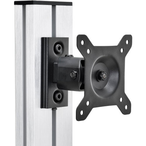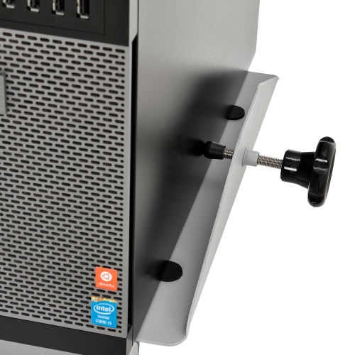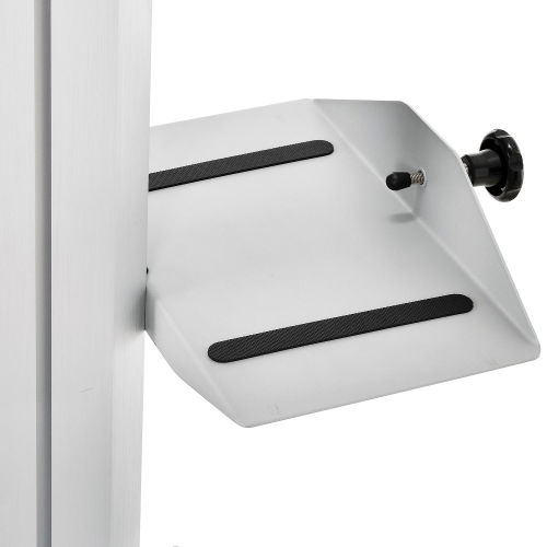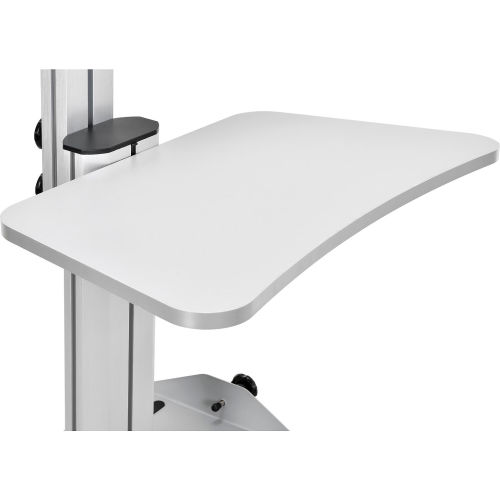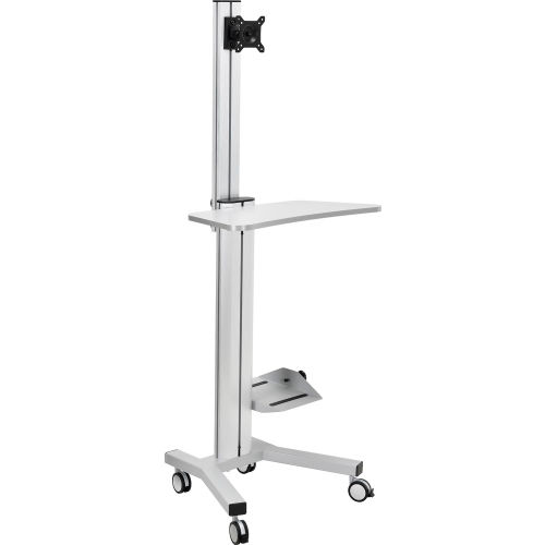 Mobile Height Adjustable Desktop Computer Workstation with 4-Outlet Power Strip This Mobile Height-adjustable Desktop Computer Workstation with 4-Outlet Power strip is perfect for office or medical urgent care environments. The workstation comes with a VESA 75/100 mount which can adjust for tilt, pan, as well as mounting height. The 27"W x 14 1/4"D work surface is sturdy and height-adjustable as well. The extruded aluminum posts are strong and corrosion-resistant, and come with 4 integrated switched power outlets as well as a CPU holder. The posts can host a variety of optional accessories including a printer stand and an accessory basket. Max capacity 220lbs on 4 casters (two with brakes) Total Dimensions: 27"W x 19 11/16"D x 69 1/4"H VESA: 75x75 & 100x100 for 10"-24" Monitors (33lbs Max) -Base Height: 5 3/8" -Base Width: 22" -Base Depth: 19 11/16" Worksurface size: 27"W x 14 1/4"D Max CPU width: 7 1/2"W Max CPU weight: 22lbsMax capacity: 220lbs Weight: 57 lbs.