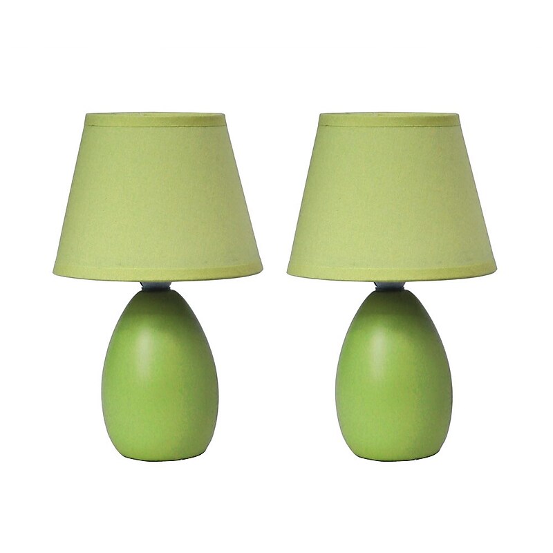 A lovely, inexpensive, and practical table lamp set to meet your basic fashion lighting needs. These mini lamps feature an oval shaped ceramic base and matching fabric shades. Perfect for living room, bedroom, office, kids room, or college dorm!. 2 x Mini oval ceramic bases. 2 x Matching fabric shades. Perfect for living room, bedroom, office, kids room, or college dorm. Each measures: Height: 9. 45" Shade diameter: 5. 5". Each uses 1 x 40W type B E12 Candelabra Base bulb (not included).