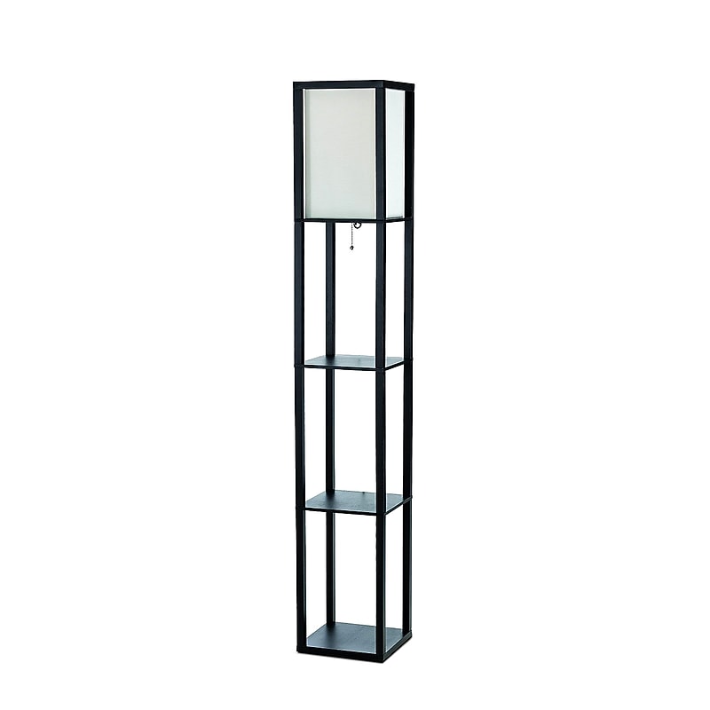 Simple Designs Floor Lamp Etagere Organizer Storage Shelf with Linen Shade, Floor lamp with 3 shelves for storage/display. Pull-chain on/off switch. Linen shade casts soft, warm glow. Lamp measures: L:10. 2" x W:10. 2" x H:63. 3". Uses 1 x 100W Type A medium base bulb (not included). Assembly required. Illuminate your living space in style with our floor shelf lamp with linen shade. This gorgeous piece adds versatility as the shelves can be used to display photographs and other memorabilia while the linen lamp shade casts a soft, warming light throughout your living space. This lamp adds sophistication and style to any home's dcor.