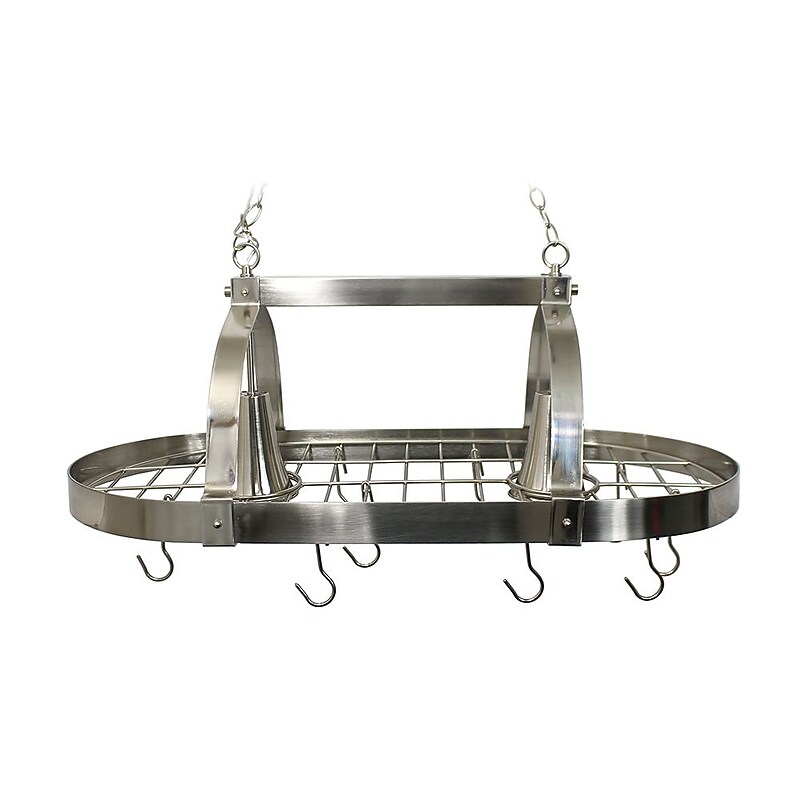 Update your kitchen in style with this industrial look two light pot rack fixture featuring a brushed nickel finish. Make your pots and utensils easily accessible in a stylish way with this traditional design, as well as extra lighting for your every day tasks. Comes with 2 chains (each measures 36"), 2 feet of cord (from top of fixture) and 10 hooks. Fixture requires two 60-Watt Type A standard medium base incandescent bulbs (not included). Brushed Nickel Finish. Requires two 60-Watt Type A standard medium base incandescent bulbs (not included). Product Dimensions: L: 35. 70" x W: 18. 80" x H: 13. 40". 2 chains. Each chain measures 3 feet. Includes 10 hooks and installation hardware. L: 35. 70" x W: 18. 80" x H: 13. 40" (rack only, not including chains).