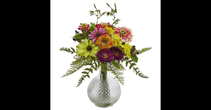 Chic glass vase is bursting with color in a medley of flowers. Textured arrangement with lifelike appearance is perfect in the entryway or family room. Dimensions: 15"H x 11"W x 9"D. Assortment of flowers. Bursting with color. Lush leaves add dimension. Includes chic vase.