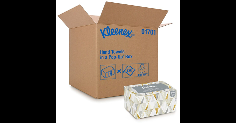 Provide a convenient tabletop solution for restroom hand drying with these pop-up hand towels. Their textured surface is highly absorbent for soaking up water, and this box of 120 Kleenex dry wipes has one-at-a-time dispensing for maintaining sanitary environments. Pop-up multifold paper hand towels are ideal for everyday use. 120 sheets per box, 18 boxes per carton (2160 sheets total). 1-ply towels for busy work environments and high-traffic washrooms.sheets look clean and sanitary. Eco-friendly choice with at least 40% post-consumer content. Made of 50% recycled materials. Meets or exceeds EcoLogo/FSC standards. Offer guests and customers these Kleenex hand towels for drying clean hands.