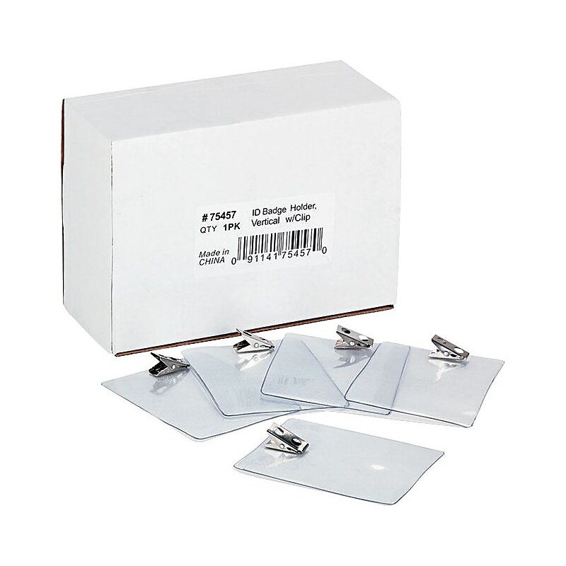 The ideal choice for ID cards and name badges, these ADVANTUS ID Badge Holders are made of durable, long-lasting vinyl. Sized to hold 3 x 4 inch inserts, these vertical badge holders are each pre-punched for chain or clip use (clips included). Badges or ID cards will be securely protected from the elements and easy to access for swiping at security checkpoints. Available in a box containing 50 badge holders, these are an excellent choice for small or large office use. For security and ID cards. Made of sturdy vinyl. Punched for chain or clip use. 3"W x 4"L. 50 holders per box. Vertical w/Clip.