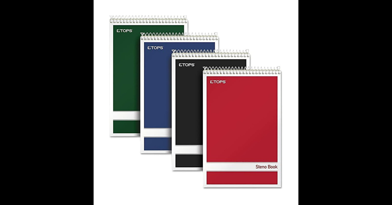 The classic flip-top format gives quick access to notes and lists. The size tucks easily into any backpack or bag. Perforated sheets detach easily. A sturdy no-snag coil resists catching on papers or clothing. Proudly made in the USA.color covers: red, black, blue & green. Green tint paper. Gregg ruled, 80 sheets. 4 Pack. Steno Book. 80 Sheets; 9". Gregg Ruled.Colors. Chipboard Cover. Non-perforated sheets. Spiral Bound. 4 per Pack. Made in the USA. These TOPS Steno Books come in an array of bright, bold colors ideal for home, school or office.
