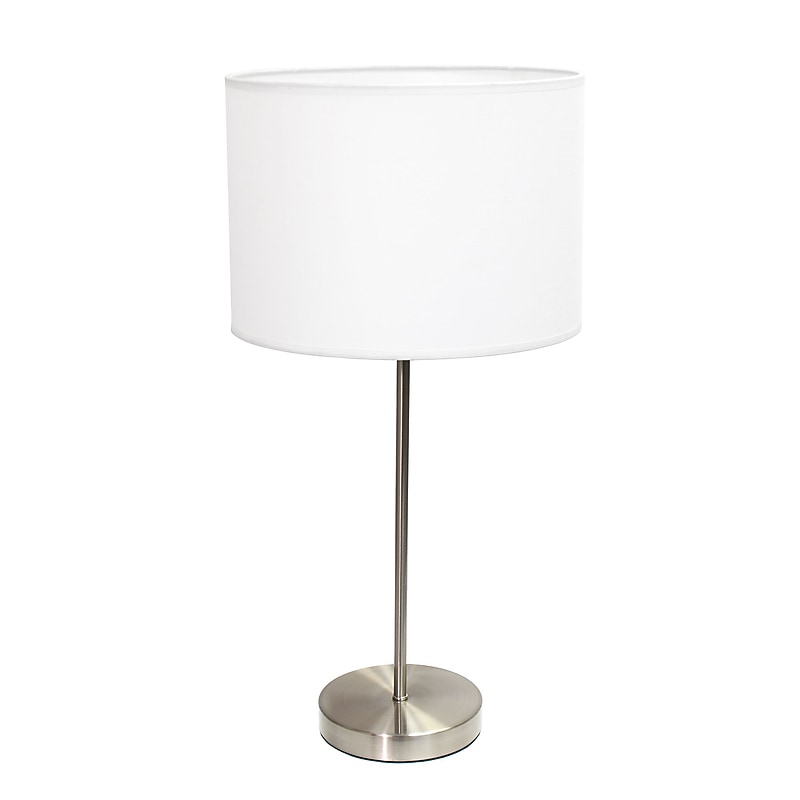 Simple Designs Brushed Nickel Stick Lamp with Fabric Shade, White. Brushed Nickel Base. Fabric shade. Convenient ON/OFF cord switch. Shade Diameter: 11" x Height: 23". Uses 1 x 60W type A medium base bulb (not included). This contemporary stick lamp features a brushed nickel base and a fabric drum shade. This lamp will add a modern touch to any space. Perfect for living room, bedroom, dorm, office, or anywhere you need to add fashion lighting.