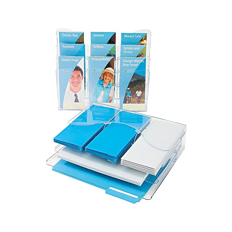 Configurable display can hold a combination of magazine and leaflet/pamphlet size literature. Displays a combination of magazine and leaflet/pamphlet size literature. Also accomodates letter, legal and A4 size documents. Ribs in bottom of compartments eliminate drooping. Organizer lies flat or stands upright on desktop to conserve space. Includes six removable dividers to create up to nine compartments. Versatile organizer for desktop or wall mount use.