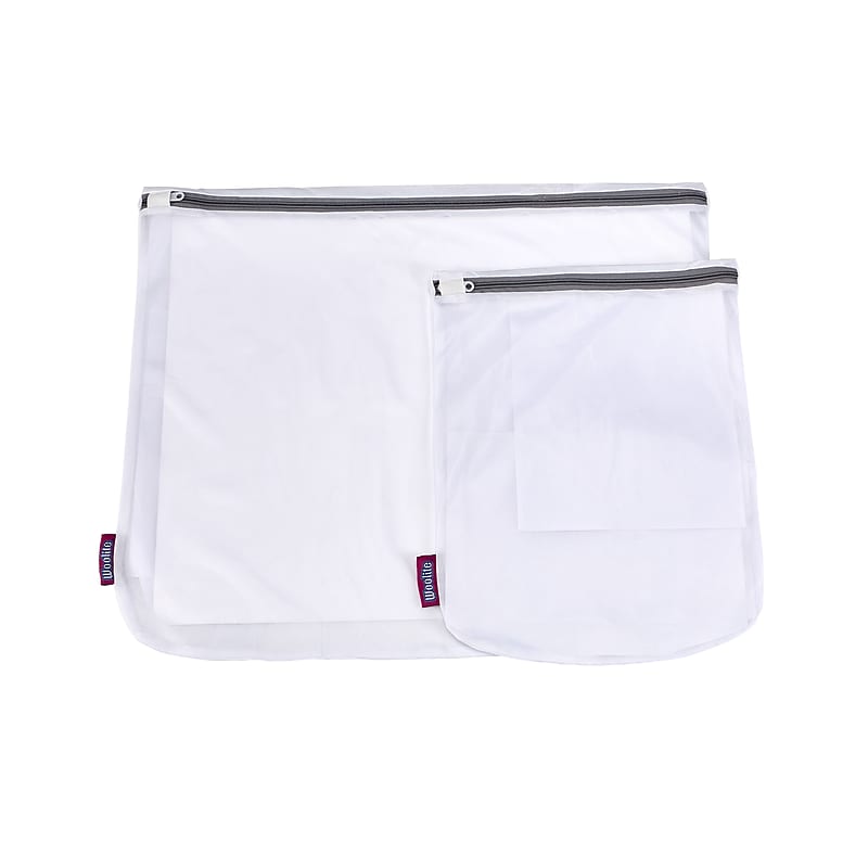 2 Pack Mesh Wash Bag Set is the perfect way to protect your lingerie, hosiery, and active wear. Set Includes 1 Large Bag 23" x20" and 1 Medium Bag 12" x16. 5". New & Improved Woolite Wash Bags now treated with Sanitize Anti-Microbial agent. Keep your Wash Bags Fresh, Odorless, Mildew and Bacteria Free. 2PC mesh Wash bag set is perfect for sweaters and socks. Built in Elastic Zipper Guard to keep zipper in place while in use. Made of High Quality Micro Mesh Fabric that wont Tear or get Pulled. Helps Prolong the life of your garments by Preventing shrinking, stretching, fading and snags. With this wash bag set, shrinking, stretching, fading and snags will be prevented while helping keep your clothes looking newer, longer.
