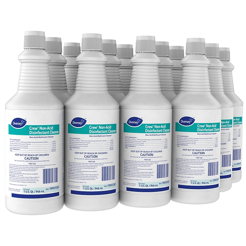 Leave surfaces clean and residue-free with this non-acid disinfectant cleaner. The special formula kills bacteria and viruses in 10 minutes to help prevent the spread of illnesses, and the cleaner is EPA registered to reduce damage to the environment. This Crew disinfectant cleaner has a flip-top bottle for easy use. Diversey Crew Non-Acid Disinfectant Cleaner is a neutral non-acid, multi-surface restroom disinfectant that cleans, disinfects and deodorizes toilet bowls, urinals, sinks, faucets, countertops and other hard, nonporous bathroom surfaces in one easy step. Blue color with a fresh scent. All-purpose liquid cleaning solution with a fresh scent. oz. capacity. Liquid cleaner is sold in a carton, 12-count per carton. Active chemicals: alkyl dimethyl benzyl ammonium chloride, octyl decyl dimethyl ammonium chloride, didecyl dimethyl ammonium chloride, dioctyl dimethyl ammonium chloride. Deodorizes and eliminates unpleasant odors. Meets or exceeds EPA and OSHA's Bloodborne Pathogens standards. Customer may receive product with either flip-spout cap or snap cap. Remove dirt and grime with this case of 12 bottles of Crew 32-ounce non-acid disinfectant cleaner.
