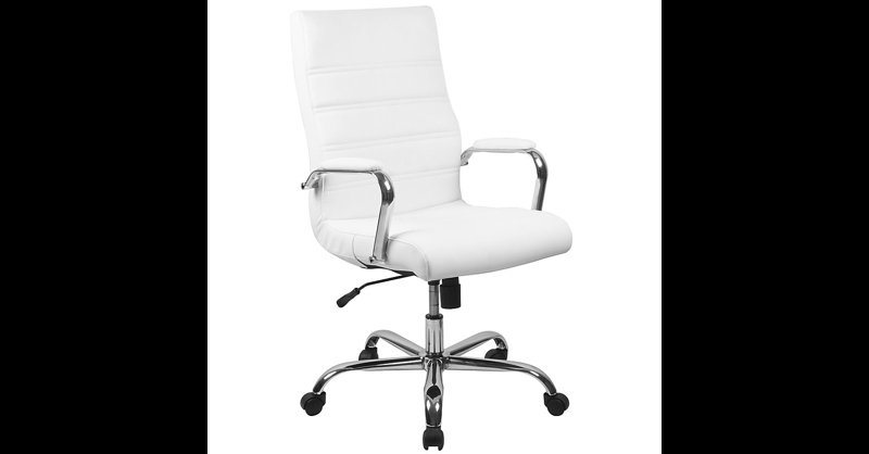 An elegant blend of comfort and style, this high-back LeatherSoft office chair is the perfect seating solution for your workspace. The marriage ofLeatherSoft upholstery with a chrome base and arms gives this chair an upscale, high-end look that will make a statement. Designed for exceptional comfort, this office chair features a generously cushioned seat and back and padded arms. The high-back office chair supports your upper back and helps relieve back tension and a waterfall front seat edge removes pressure on your lower legs. Complete your custom fit with the pneumatic seat height adjustment lever and tilt-lock mechanism for a rocking and reclining motion. The full 360-degree swivel chair motion is ideal for shifting between work surfaces and the smooth motion of the wheeled base allows you to effortlessly reach things a little further away. Let this well made chair ease the stresses of your long workday. Leather Executive Office Chairs. Color: White LeatherSoft/Chrome Frame; Material: Chrome, Foam, Leather/Faux Leather, Metal, Plastic. Ergonomic - Waterfall Seat. Overall Dimensions: 26"W x 27"D x 39. 25" - 43"H. Seat Dimensions: 18. 25" - 22. 25"H x 19"W x 19"D. Back Dimensions: 18. 5"W x 23"H. Padded Arms. Rated for up to 250 lbs Based on 6-8 Hours Use. Care Instructions: DC-Damp cloth. Assembly Required. ANSI/BIFMA compliant for safety. Warranty: 2 Years Limited. Modern Executive Office Chair with Arms. White LeatherSoft is Soft and Durable. High Back Design with lumbar support. Swivel Seat with CAL 117 Fire Retardant Foam. Waterfall Seat reduces pressure on your legs. Tilt Lock Mechanism rocks/tilts the chair and locks in an upright position. Tilt Tension Adjustment Knob adjusts the chair's backward tilt resistance. Pneumatic Seat Height Adjustment. 5-Star Chrome Base with Dual-Wheel Casters. Whether you own the company, manage an entire staff, schedule new clients, or manage calls in a call center, feel like a top executive in this Leather Executive Office Chair.