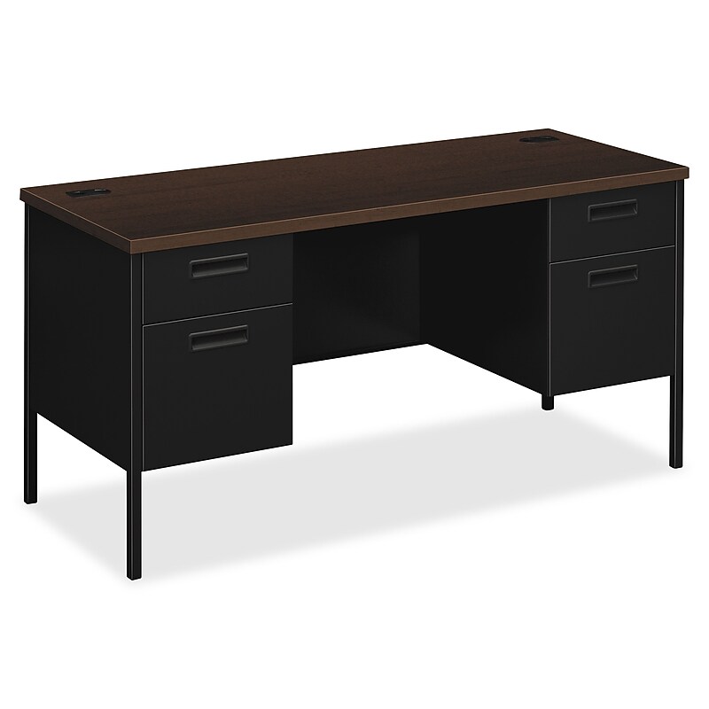 Classic, no-nonsense style for the practical, well-organized office. Durable laminate top helps resist damage. High-sided file drawers with full-extension triple-tied cradles and spring-loaded follower blocks; box drawers extend three-quarters on nylon rollers. Wire grommets offer convenient cable management. 3/4-height modesty panel provides privacy. Flush drawer pulls. Includes 2 box drawers for supplies and 2 file drawers for documents. End panels feature double-walled construction to resist impact and dampen sound. Durable laminate top resists damage. High-sided file drawers with full-extension triple-tied cradles and spring-loaded follower blocks; box drawers extend three-quarters on nylon rollers. Grommets for cable management. Finish: Mocha/Black. Dimensions: 29-1/2"H x 60"W x 24"D. Backed by the HON Full Lifetime Warranty. Model Option: HP3231. MOCH. P.