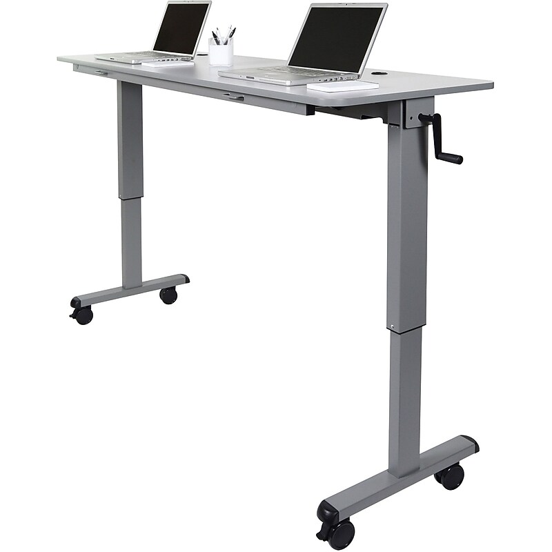 Luxors new flip top table is a multipurpose sit/stand desk thats perfect for schools, training rooms, or general office use. The convenient crank handle adjusts the table height from 30 inch to 42. 25 inch to accommodate a range of seated or standing users, while 3 inch locking casters allow easy mobility. Adding to its versatility, each table can be neatly folded for space-saving storage using two pull-handles that flip the table into a nesting position. Choose Luxors 72 inch mobile flipper table to create a professional and ergonomic work space. Sit & Stand Desk Type. Melamine. Height adjustable (30 - 45 1/4 in. ). 71 inch W x 23. 6 inch D x 30 inch- 45. 25 inch H. Multiple tables nest together for simple storage. Weight capacity of 150 lbs. Meets ANSI/BIFMA standards. Assembly Required. Lifetime manufacturers Warranty.
