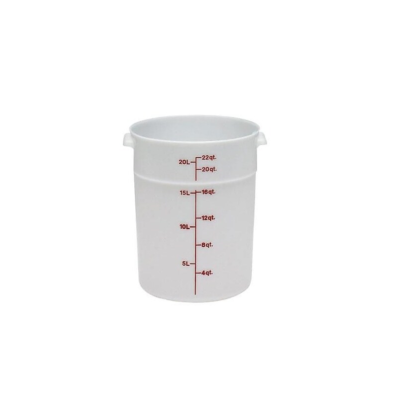 Store your perishables in this durable round storage container from Cambro. With a 22-quart capacity, this storage container's polyethylene composition is stain and chemical resistant, and keeps your products fresher longer. Its durable material is made to endure temperatures from -40 to 160 degrees F, which makes it suitable for storing hot or cold foods. Easy-to-read graduations on the exterior of this round container let you take inventory at a glance. Use Cambro's coordinating lid to stack this food storage container for even more organization. 14 7/8" D X 15" H. Food storage container. Impact, stain and chemical resistant solid white plastic material. Round shape promotes air circulation. Easy to read imprinted graduations on outside of container. -40 degreesto 160 degrees F temperature range. Dishwasher safe. NSF certified.