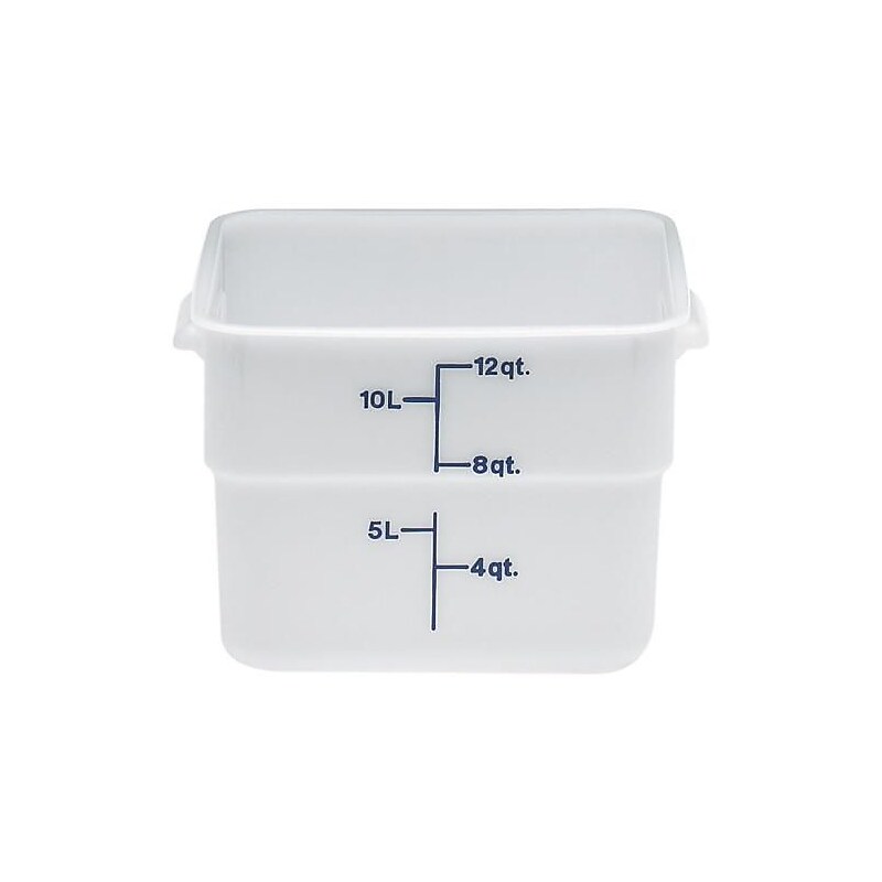 Safely store your products with this Cambro 12SFSP148 Qt. square food storage container! This food storage container is made of impact resistant solidplastic that won't be stained or harmed by food acids, oils, and alcohol. Thanks to its square shape, this container can be conveniently packed onto shelves without wasting space, while its easy-to-read midnight blue-colored gradations allow you to manage your inventory at a glance. This square container can withstand temperatures from -40 to 210 degrees Fahrenheit, ensuring its safe use in both refrigerators and freezers. 11 1/4" L x 1/4" W x 8 1/4" H. Food storage container. High chemical and stain resistant material. Space efficient storage. Good impact resistance. -40 degreesto 160 degrees F temperature range. Safe for use in high temperature dishwashers. NSF certified.