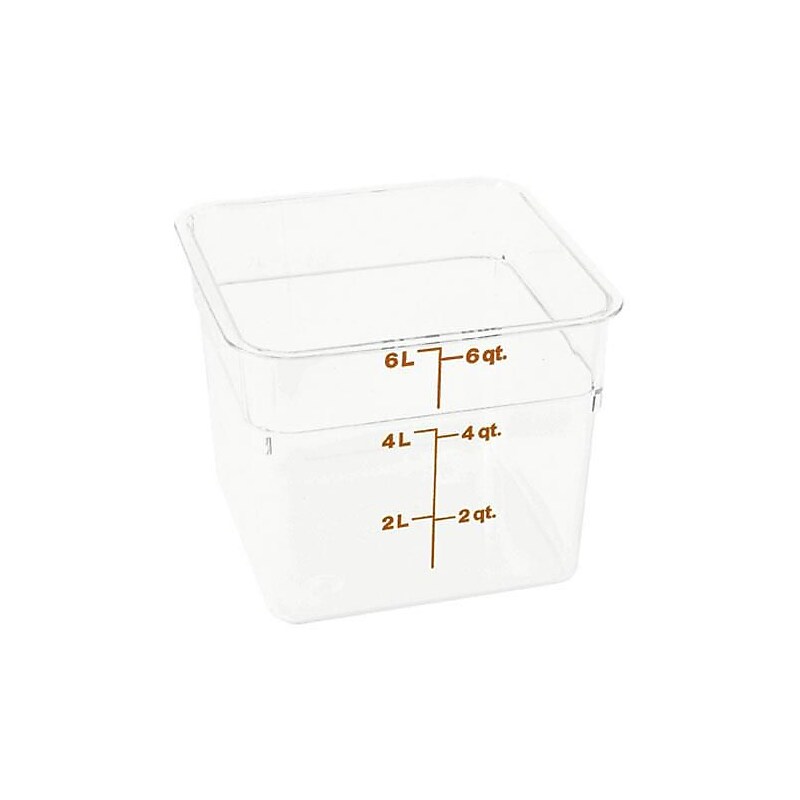 Exceedingly versatile in both size and design, this container is perfect for portioning and storing all your ingredients, toppings, and pre-prepared foods. Simply pair with a compatible lid (sold separately) to keep your foods fresh. Its crystalclarity lets you quickly recognize contents and minimize unnecessary openings, while a Qt. capacity provides users with plenty of storage possibilities. 8 3/8" L x 8 3/8" W x 7 1/4" H. Qt. food storage container. Clear polycarbonate construction. -40 degreesto 210 degrees F temperature range. Graduations. Stackable. NSF certified. Made in USA. Lid sold separately. WARNING: This product contains a chemical known to the State of California to cause birth defects or other reproductive harm.