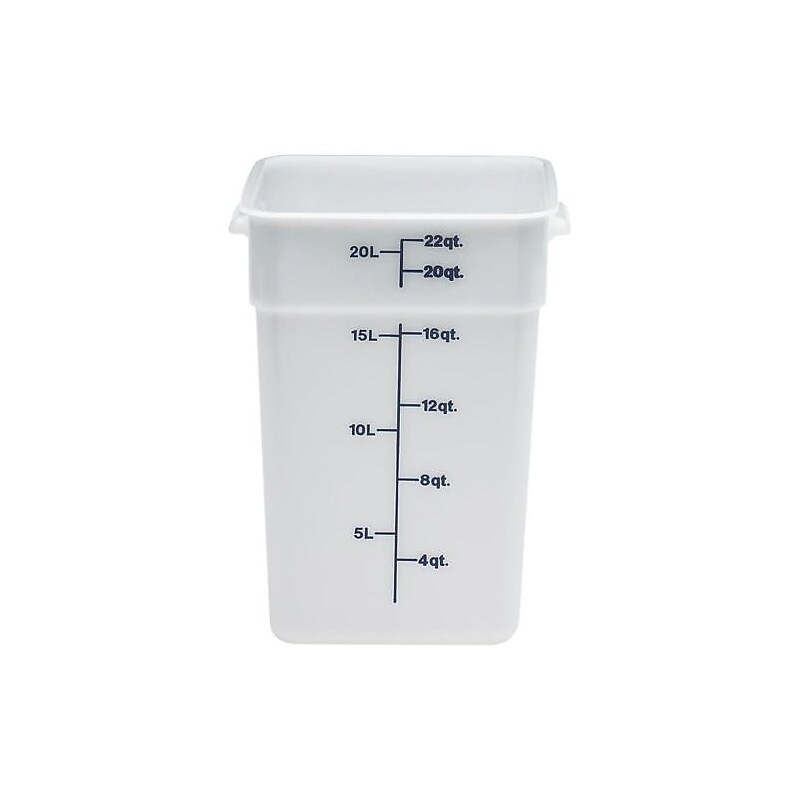 Maximize your storage space with thisQt. CamSquare container made of impact, stain and chemical-resistant polyethylene. It has easy-to-read blue graduations on the outside that let you take inventory at a glance, and you can pair this container up with the matching color-coded lid to keep things even better organized. This container withstands temperatures from -40 degrees F to 160 degrees F, making it good for both hot and cold food. WARNING: This product contains a chemical known to the State of California to cause birth defects or other reproductive harm. 11 1/4" L x 12 1/4" W x 15 3/4" H. Food storage container. High chemical and stain resistant material. Space efficient storage. Good impact resistance. -40 degreesto 160 degrees F temperature range. Safe for use in high temperature dishwashers. NSF certified.