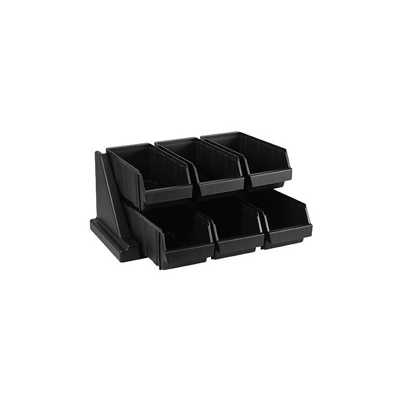 This Cambro 6RS6110 black Versa self-serve condiment bin stand set with 6 bins is a must have, space-saving addition to not only any coffee shop, convenience store or restaurant, but outside of food service as well! The Cambro 6RS6110 Versa condiment holder stand with bins is great for countertop use, or can be easily mounted to a wall to hold many food service supplies such as sugar packets, coffee creamers, straws, coffee stirrers and disposable utensils, as well as industrial supplies such as small tools and parts that need to be kept separated and organized. 2-tier stand and six, 12" condiment bins included. Can be wall-mounted or placed on flat surface. Each bin can hold up to 10 lbs. Versa Line. Organizer Rack with 6 bins, can be wall-mounted (each bin can hold up to 10 lbs. ) or placed on flat surface.