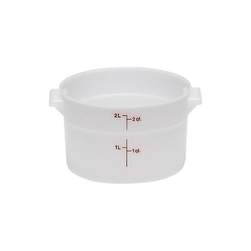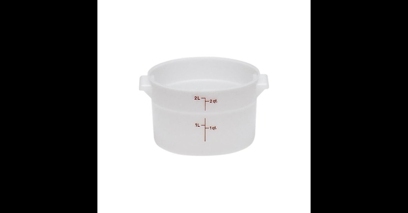 Round storage containers are ideal for storing soups, chilies, sauces, and dips! This quart round storage container is chemical, impact, and stain resistant making it exceptionally easy to clean and maintain. Need quality food storage Cambro is happy to present you with this versatile, high endurance, quality quart round storage container. This Qt. round storage container is constructed of heavy duty polyethylene and is able to store ingredients up to 140 degrees. You can also use your round storage containers in the freezer! For use with both warm and cold foods and ingredients this round storage counter is completely versatile and are an excellent investment for any kitchen. Featuring a translucent finish with red imprinted graduations, this quart round storage container is ideal for no nonsense measuring and mixing! Bring quality round storage containers to your kitchen today. 8 3/16" D x 4 3/16" H. Impact, stain and chemical resistant solidplastic material. Round shape promotes air circulation. Easy to read imprinted graduations on outside of container. -40 degrees to 160 degrees F temperature range. Dishwasher safe. NSF certified.