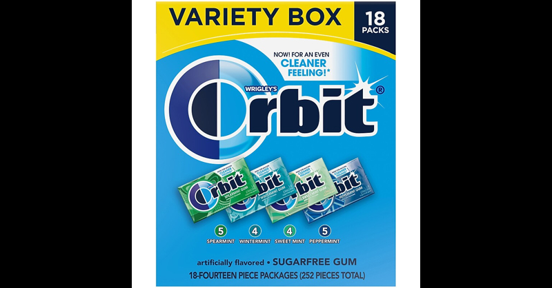 With ORBIT Sugar Free Gum, delicious variety pack of ORBIT Spearmint Chewing Gum, ORBIT Wintermint Chewing Gum, ORBIT Sweet Mint Chewing Gum, ORBIT Peppermint Chewing Gum flavors that give you a clean and fresh mouth feeling so you're ready to seize your moment with this bulk gum assorted pack. Package includes 5 Peppermint single packs, 4 Wintermint single packs, 5 Spearmint single packs, and 4 Sweet Mint single packs. Make the most of the moment with the clean and fresh mouth feeling of ORBIT Gum. With the Variety Pack, you get four delicious ORBIT flavors: Peppermint, Wintermint, Spearmint and Sweet Mint. A sweet treat for 5 calories or less per piece. ORBIT Gum has received the American Dental Association Seal of Acceptance in recognition of the oral-care benefits of chewing sugar-free gum. Individually wrapped. With ORBIT Sugar Free Gum, delicious variety pack of ORBIT Spearmint Chewing Gum, ORBIT Wintermint Chewing Gum, ORBIT Sweet Mint Chewing Gum, ORBIT Peppermint Chewing Gum flavors that give you a clean and fresh mouth feeling so you're ready to seize your moment with this bulk gum assorted pack.