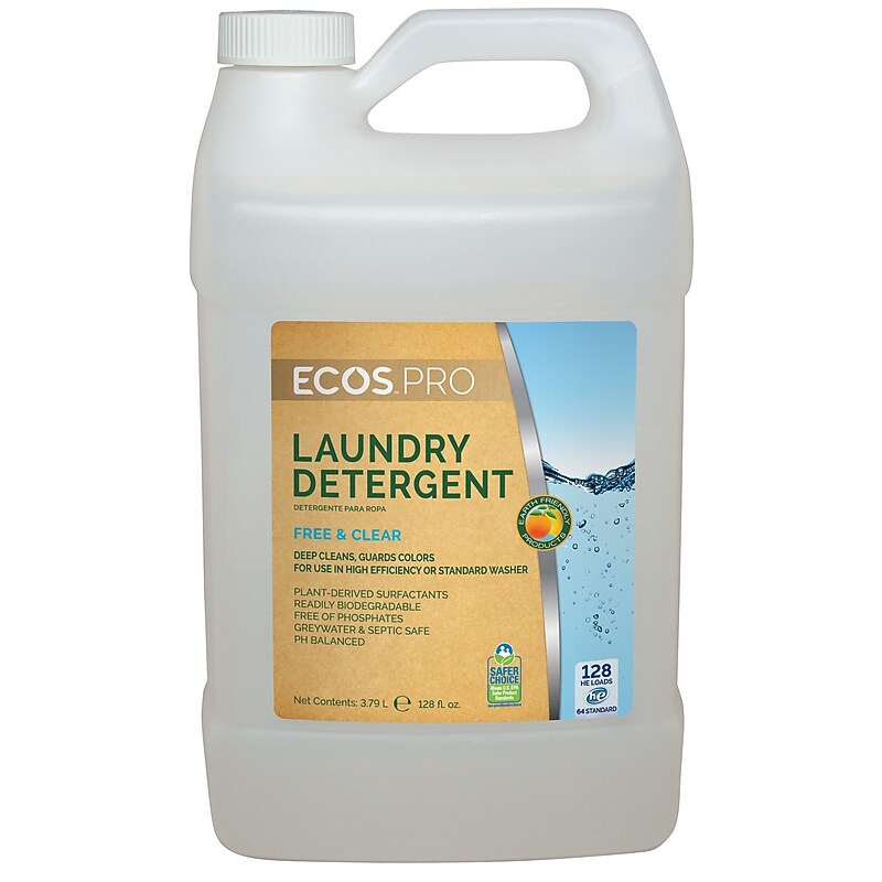 Laundry liquid detergent. 1 gallon bottle. Formulation does not contain any essential oils for fragrance, nor does it contain any coconut based fabric softener. ECOS Free & Clear Laundry detergent is for people with strong sensitivities to fragrance, fabric softeners, or cellulose optical brighteners. Can be used in high-efficiency machines or standard machines and in hot, warm or cold water. Readily biodegradable, pH balanced formula is made using sustainable, plant-derived ingredients. Product is free of dyes; greywater and septic safe. Hypoallergenic. Recognized by the EPA's DfE and USDA's Biopreferred Program. GHS compliant labels. This product is manufactured by a certified WBE (women owned business). This product is manufactured by a certified MBE (minority owned business). Safety Data Sheet.