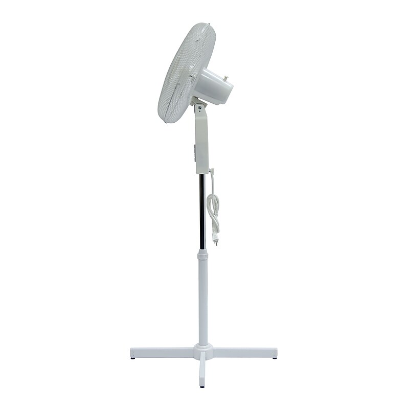 The TPI OSF16 workstation oscillating stand fan has plastic housing and blade for long life durability. The fan with 2100 CFM, features 3-speed motor with push-button controls and the height is adjustable up to 40". It has a voltage rating of 120 V and current rating of 0. 5 A. It is perfect for homes and offices. It includes white powder-coated wire mesh guards, 3 plastic fan blades, 3 conductor SPT cord and plug. 3-speed with push button controls. Dimensions: 40"H x 26"W x 19"D. Comes in white color with powder-coated wire mesh guards, plastic housing and blade. Motor features: 120 V. Cord: 3 conductor SPT cord and plug. Speed: 2100 CFM (high). Current rating: 0. 5 A. Mount type: Pedestal. Assembly information: Assembled. Fan blade diameter: 16". Pivot-action fan head allows tilt adjustments. Includes power cord. Meets OSHA, UL standards. Weight: 15. 5 lbs. Comes with 1 year limited warranty. ⚠ WARNING: This product can expose you to chemicals including nickel which is known to the State of California to cause cancer, and chromium which is known to the State of California to cause birth defects and/or reproductive harm. For information go to www. P65Warnings. ca. gov. workstation oscillating stand fan is great for homes and offices and its features white plastic housing and blade.