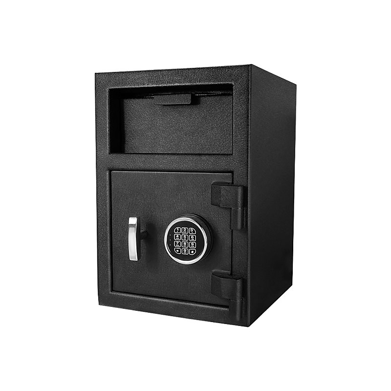 Store business receipts and deposits safely and securely in this DX-200 standard depository keypad safe. The digital keypad stores up to two user-defined PIN codes, increasing efficiency by allowing additional staff members to have access. The top drawer comes equipped with a row of tough, jagged teeth that are positioned to prevent the contents from being fished out by unauthorized parties, adding an extra layer of protection. The keypad's lockout mode deactivates the keypad in case someone keys in the incorrect password too many times, preventing multiple log-in attempts. This Barska standard depository keypad safe comes with a set of two emergency backup keys in case the PIN codes are forgotten or misplaced. Safe provides safety and security for your essential documents and most valuable possessions. Constructed of solid steel material with PIN code. Overall dimensions: 20. 08"H x 14. 17"W x 14. 17"D. Interior dimensions: 12"H x 13. 5"W x 11"D. Product weight: 79. 59 lbs. The digital keypad can store up to two user-defined PIN codes. Includes protective floor mat ensuring that items are not scratched. To resist tampering, this safe has a drop drawer with a row of jagged teeth that prevents deposited objects from being fished out. Operates on one 9V battery, included. Pre-drilled mounting holes on the bottom of the drop safe permit mounting with the included hardware. 1-year manufacturer limited warranty. ⚠ WARNING: Cancer and Reproductive Harm www. P65Warnings. ca. gov. Store business receipts and deposits safely and securely in this Barska DX-200 standard depository keypad safe.