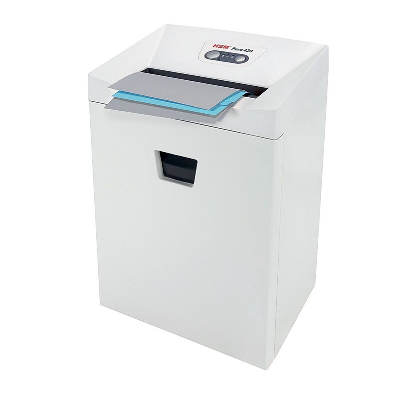 Made for everyday office use. The document shredder with a powerful engine and quiet continuous operation shreds even larger quantities of paper easily and reliably. The waste container can be easily removed and emptied. Made for everyday office use by 1 to 6 users. High quality materials and "Made in Germany" quality for security and durability. Cutting rollers made of hardened steel with lifetime warranty. Powerful motor allows for continuous operation. Quiet operation minimizes noise development in the workplace. Low power consumption in standby mode. Paper feed with overload protection reduces paper jams. Automatically switches off if pressure is applied to the safety element. Light barrier for automatic start/stop. Mobile on castors. Removable waste container for effortless emptying. Separate collecting bag for the sorted separation of the shredded material. Level indicator through inspection window. Timeless machine design in trendy HSM Pure 420c Cross-Cut Shredder; shreds up to 16 sheets; 9. 2-gallon capacity.