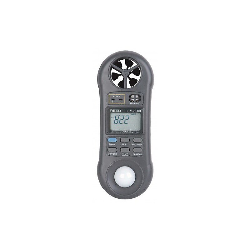 This compact 6-in-1 environmental meter measures air velocity, air temperature, ambient temperature, relative humidity, light and contact temperature. The LM-8000 features Data Hold, Minimum/Max functions and has been designed for one handed operation. Measures air velocity/temperature, ambient temperature, relative humidity, contact temperature and light. Easy to operate, designed for one hand operation. Air velocity is measured in m/s, ft/min, km/h, mph or knots. Light levels are measured in foot-candles or lux. Temperature is measured in Celsius or Fahrenheit. Data Hold and Max/Min functions. Zero adjustment button (light meter). Low battery indicator and auto shut off. 6. 1"H x 2. 4"W x 1. 3"D. Air velocity range of 0. 2 to 30. 0 m/s; 1. 4 to 108. 0 kph; 0. 9 to 67. 0 mph; 80 to 5910 fpm; 0. 8 to 58. 3 knots. Air velocity resolution of 0. 1 m/s; 0. 1 kph; 0. 1 mph; 1 fpm; 0. 1 knot. Temperature range of -148 to 2372 degrees Fahrenheit (-100 to 1300 degrees Celsius). Temperature resolution of 0. 1 degrees Fahrenheit (0. 1 degrees Celsius). Humidity range of 0 to 95% RH. Humidity resolution of 0. 1%RH. Light range of 0 to 20,000 Lux (0 to 2000 ft-cd). Light resolution of 1/10 lux (0. 1/1 ft-cd). Powered by a single 9V battery (included). Weighs 8. 8 oz. (160gram). Fast responding, pocket size design allows for one-handed operation.