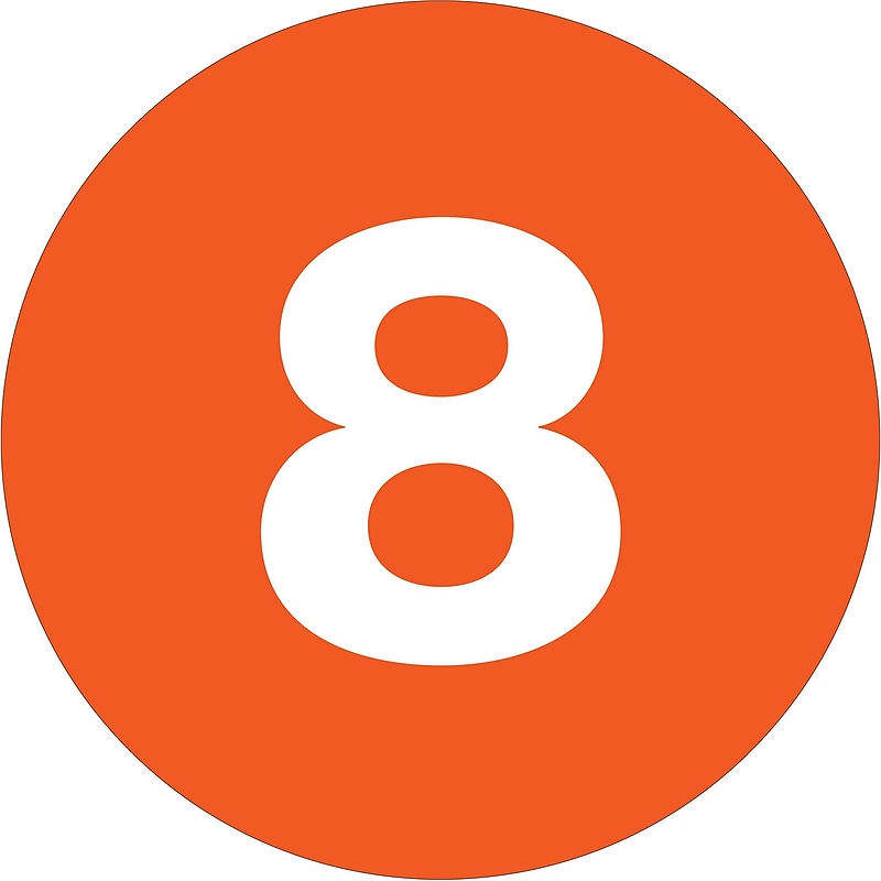 Circle - "8" Number Labels. Use brightly colored labels to identify shipments, inventory or shelving. Table top dispensers available stock numbers SL9506, SL9512 and SL9518. Wall Mount dispensers available stock numbers LDM250, LDM450, LDM850 and LDM1250. 500 per roll. Inventory Labels - Numbers. Diameter. Orange Circle Paper. 500 labels per roll. Table top dispensers available stock numbers SL9506, SL9512 and SL9518. Wall Mount dispensers available stock numbers LDM250, LDM450, LDM850 and LDM1250. Use brightly colored labels to identify shipments, inventory or shelving.